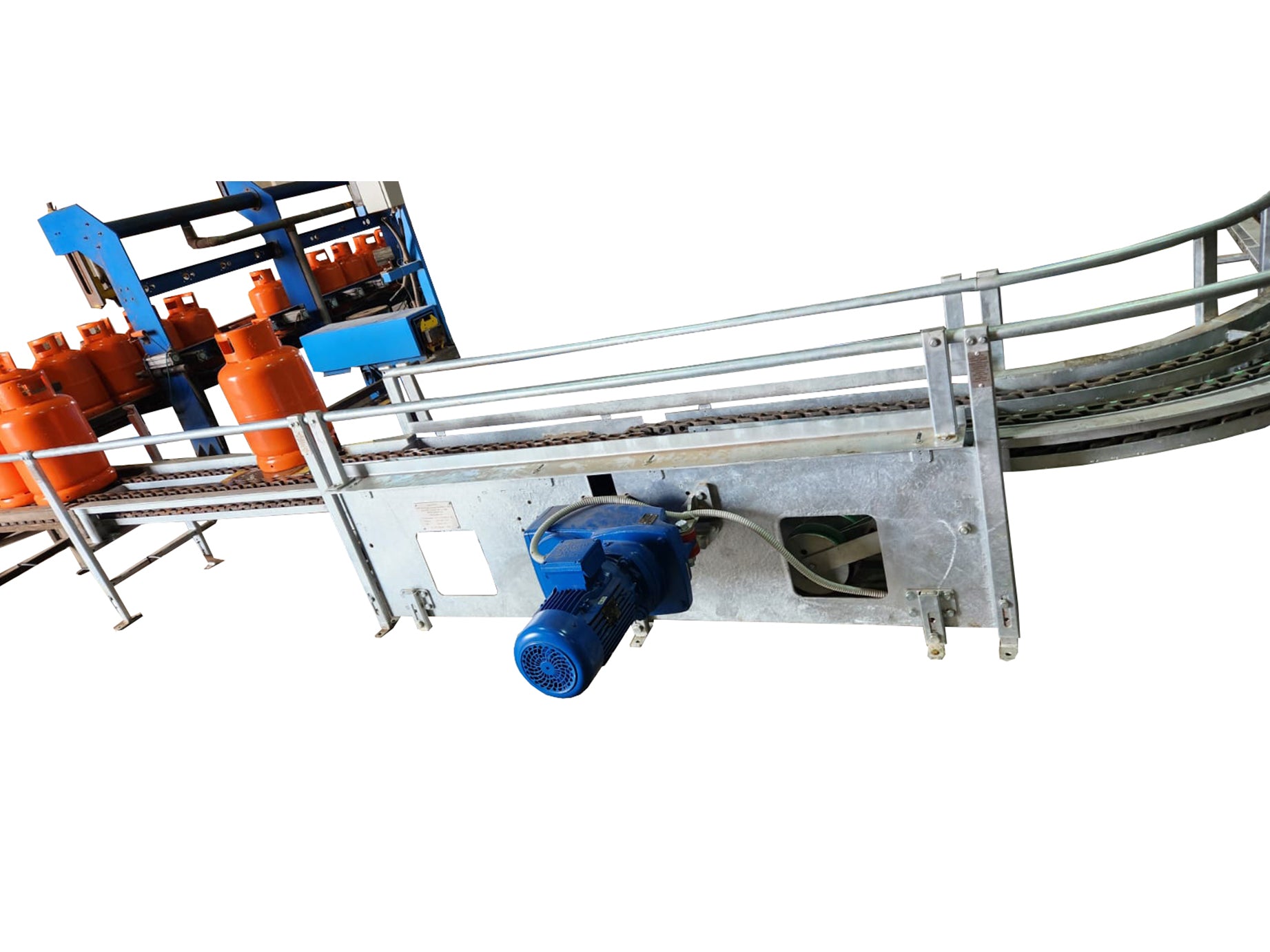 A robust and reliable conveyor system designed specifically for the safe handling and transport of LPG cylinders. Built with a heavy-duty chain mechanism, this conveyor ensures smooth movement, precise positioning, and long service life in demanding gas plant environments. It is ideal for integration with filling stations, inspection lines, and storage facilities, while maintaining the highest safety standards required in the gas industry.